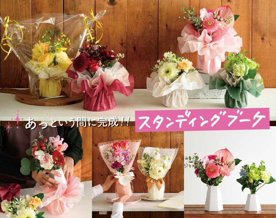 人手不足や仕上がりの差を解消し、誰がつくっても同じきれいなスタンディングブーケが作れるラッピングアイテムです。 ラッピング動画はこちら>>