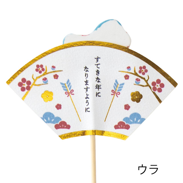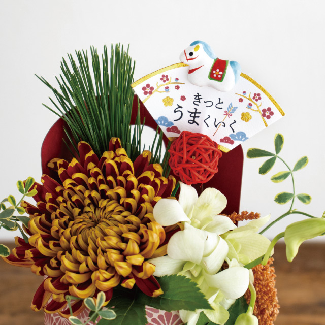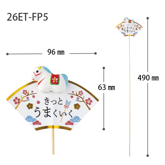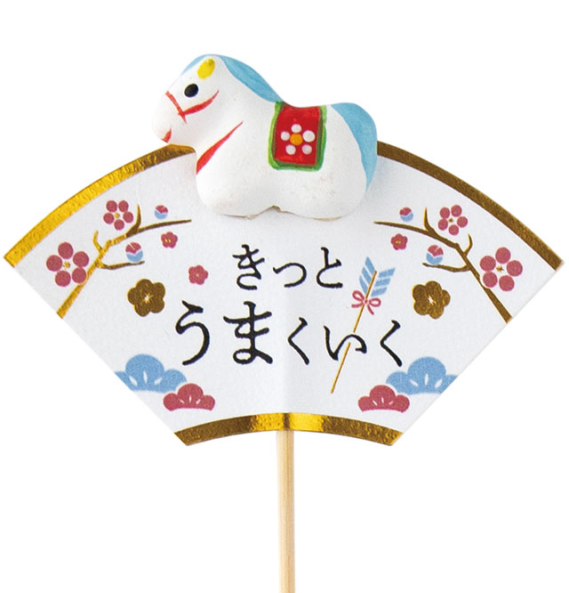 2026年の干支、午(うま)デザインのフラワーピックです。ちょこんと乗った立体的な馬モチーフが愛らしい扇型フラワーピックです。「きっと うまくいく」のポジティブなメッセージが、心温まるお正月のフラワーアレンジメントにおすすめです。