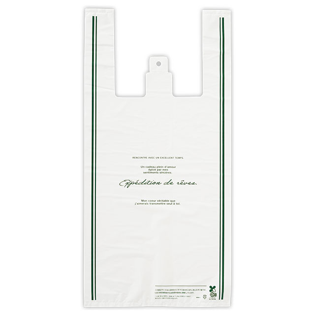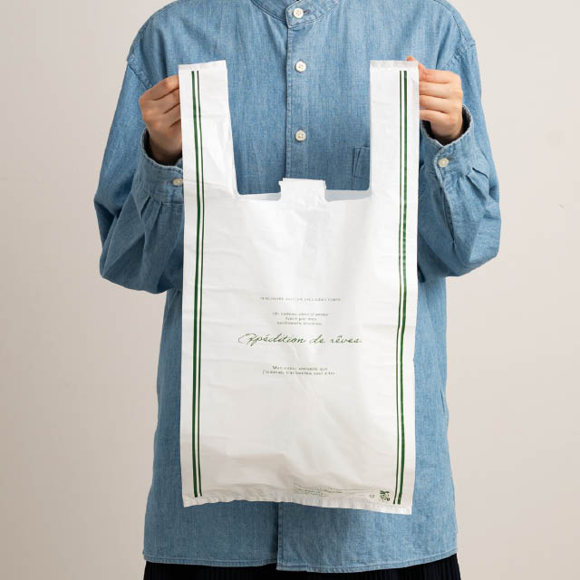 無料配布可能なバイオマス原料30%配合のレジ袋です。デコ箱5~6号が入るマチ広タイプです。スタイリッシュなデザインの中に、お店様の商品とお客様との「RENCONTRE(出会い)」を大切に包み、そしてお持ち帰りいただけるように…と想いを込めました。