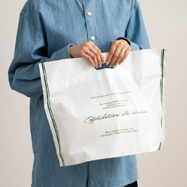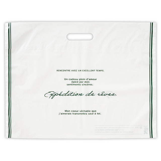無料配布可能なバイオマス原料30%配合の手提げ袋です。デコ箱4~5号が入るマチ広タイプの小判抜き手提げ袋です。スタイリッシュなデザインの中に、お店様の商品とお客様との「RENCONTRE(出会い)」を大切に包み、そしてお持ち帰りいただけるように…と想いを込めました。