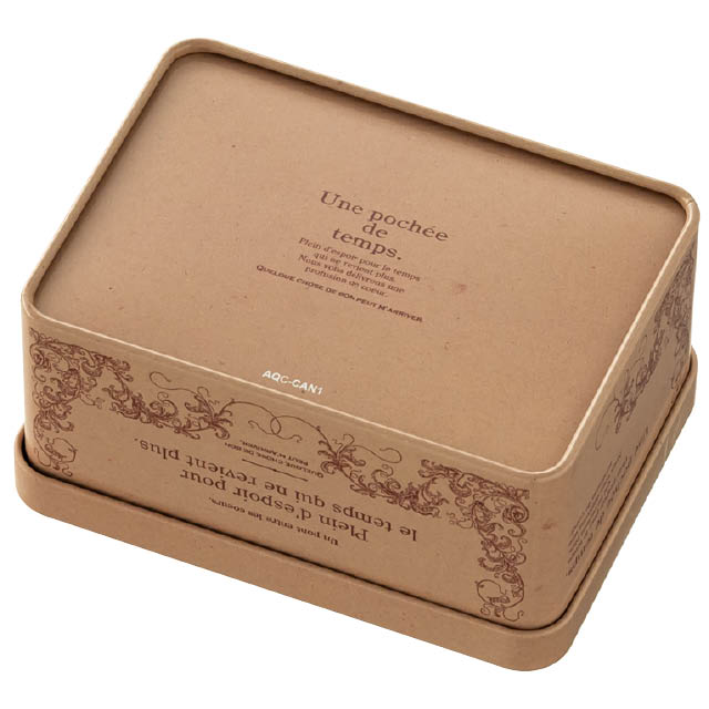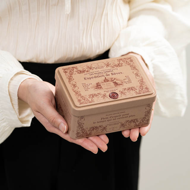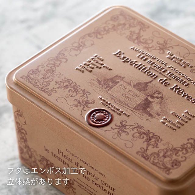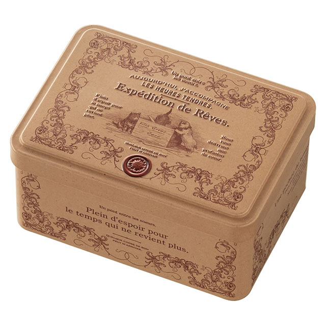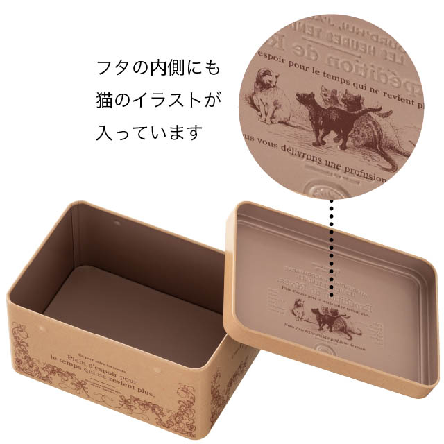 薄茶色のアンティーク調デザインが魅力的なギフト缶です。フタの表と裏には可愛いネコのイラストがあしらわれ、ナチュラルで上品な雰囲気を演出します。グラシン紙(M-GLA2)を使用したクッキー缶としてもおすすめ。個包装のお菓子や雑貨を詰めれば、特別感のあるギフトが手軽に完成します。