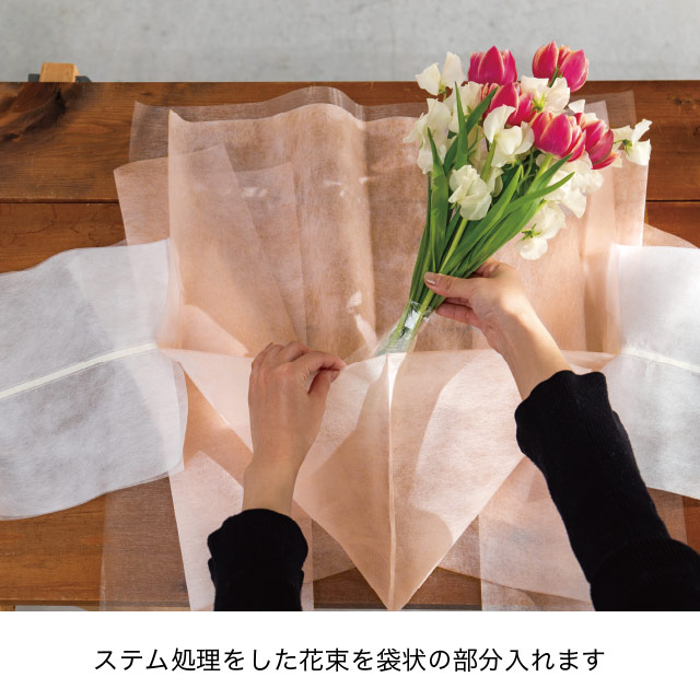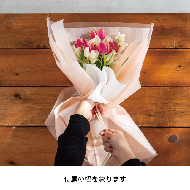 やさしい薄ピンク色のブーケ用ラッピング資材です。お花をセットしてリボンを引っ張るだけでボリュームのあるブーケラッピングが完成!ふんわりとした不織布とオーガンジー素材によって軽やかなブーケに仕上がります。