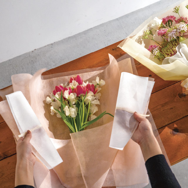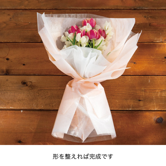 やさしい薄黄色のブーケ用ラッピング資材です。お花をセットしてリボンを引っ張るだけでボリュームのあるブーケラッピングが完成!ふんわりとした不織布とオーガンジー素材によって軽やかなブーケに仕上がります。