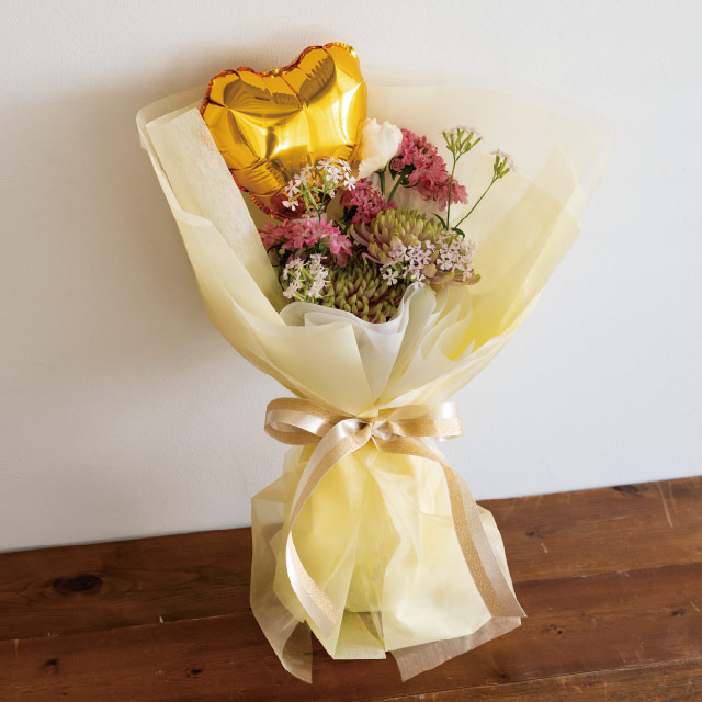 これだけでもボリュームのあるブーケが作れますが、仕上げのリボンやお好みのロールを組み合わせると、より豪華でオリジナリティのあるラッピングも可能。人気のバルーンフラワーピックとの相性も抜群です。