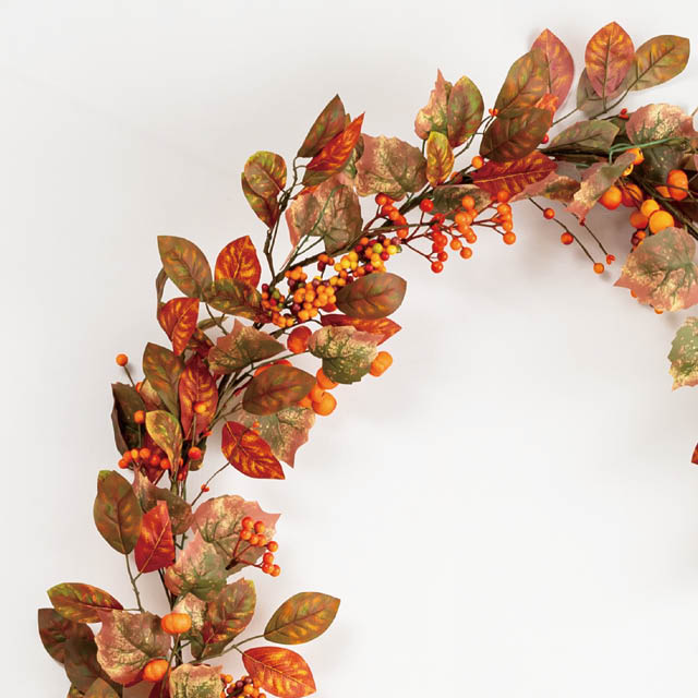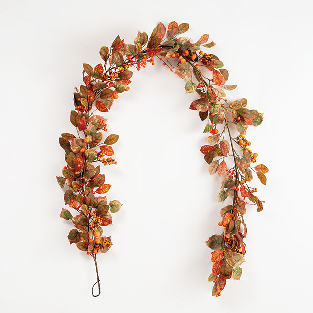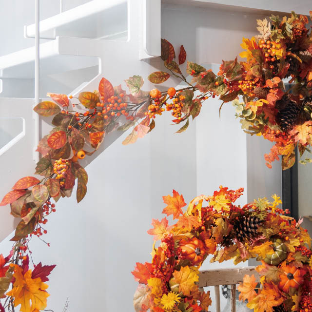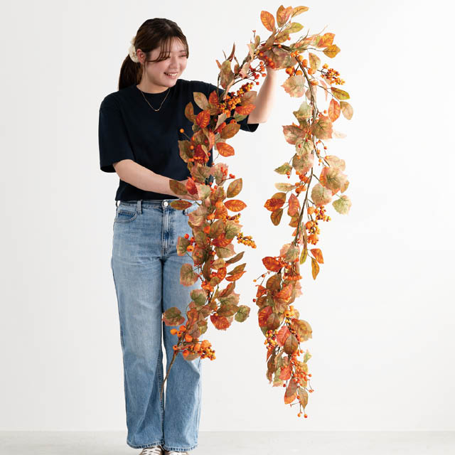 造花のガーランドです。秋の木の実と紅葉の暖かみのある色合いが店内を一気に秋色に演出してくれます。 両端に取り付け用のリングが付いていて、簡単に使えるのもポイント。ガーランドとして天井飾りに使うのはもちろん、棚やカウンター周りに飾るのも華やかでおすすめです。
