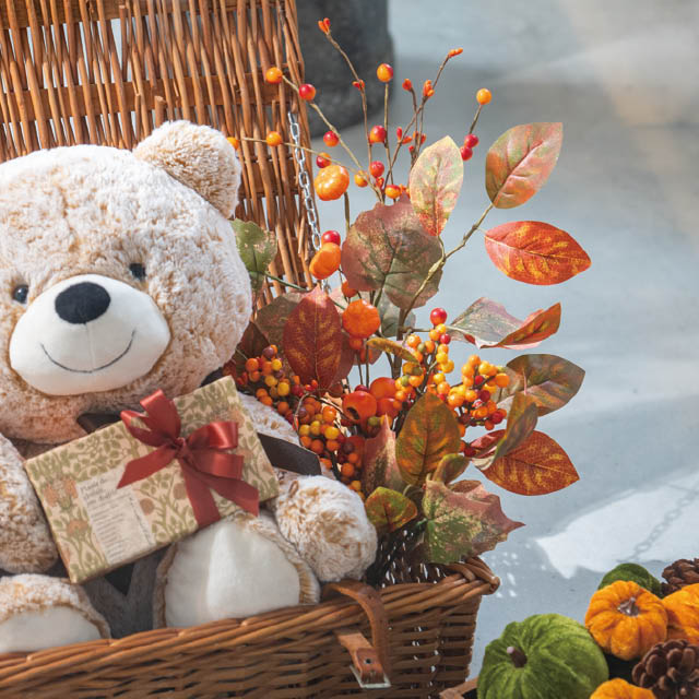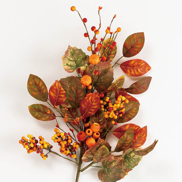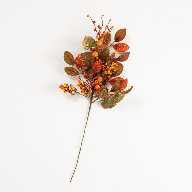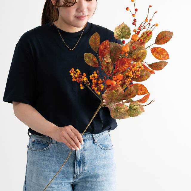 スプレータイプの造花です。W360×H840mmサイズのボリュームのある枝ぶりに色づいた秋の木の葉に、大小さまざまな木の実をあしらった造花で、棚やコーナー周りにおすすめ。花器に挿すだけで映えるのでディスプレイも簡単です。落ち着いた色味が売り場に季節の移ろいを演出。秋から冬にかけて長く飾っていただける造花です。