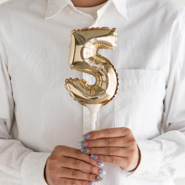 数字の「5」の形をしたゴールドのミニバルーンフラワーピックです。誕生日や周年祝いなど特別な日を華やかに彩るフラワーアレンジメントやブーケに、豪華な輝きをプラス。手軽に取り入れられてSNS映えもする魅力的なバルーンフラワーピックです。