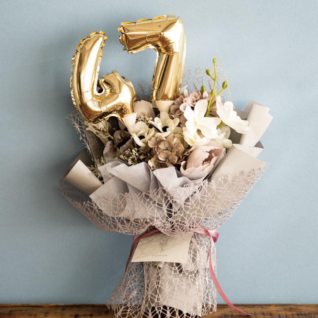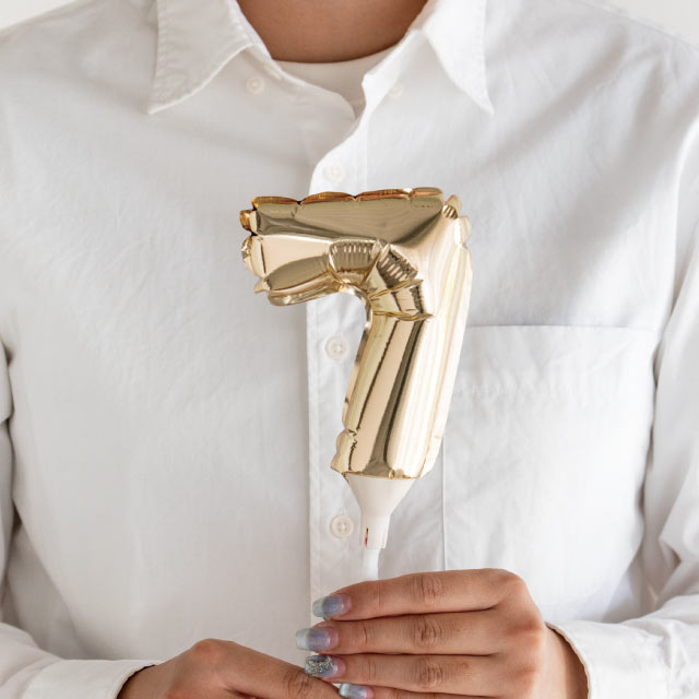 数字の「7」の形をしたゴールドのミニバルーンフラワーピックです。誕生日や周年祝いなど特別な日を華やかに彩るフラワーアレンジメントやブーケに、豪華な輝きをプラス。手軽に取り入れられてSNS映えもする魅力的なバルーンフラワーピックです。