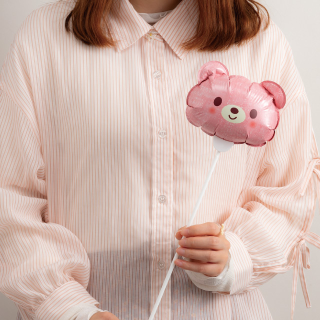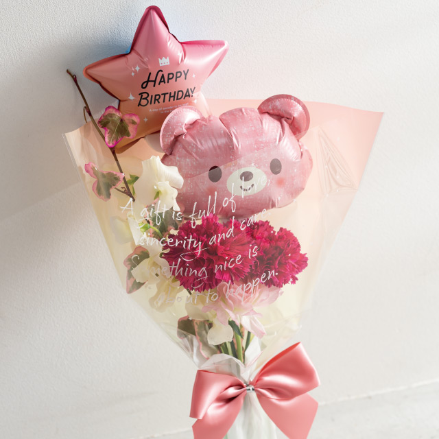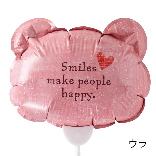 ピンクのくまさんのバルーンフラワーピックです。前面は笑顔のくまの顔、裏面には「Smiles make people happy.」とメッセージが入っており、存在感もたっぷりで、少しのお花でボリューム感のある可愛いブーケが作れます。子供から大人まで、世代を問わず喜ばれるキュートなフラワーピックです。発表会や入学卒業、バースデー、成人式などのお祝いにはもちろん、母の日など様々なギフトシーンにお使いいただけます。