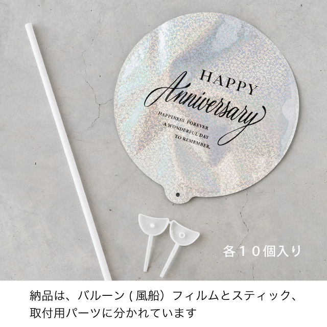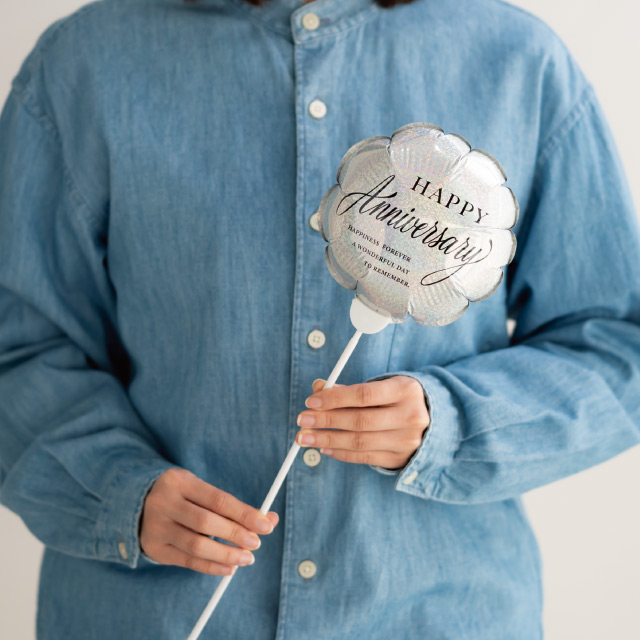銀のホログラムに「HAPPY Anniversary」のメッセージをあしらった記念日のフラワーバルーンピックです。縦横140mmサイズで存在感たっぷり。少ない花材でもボリュームのある可愛いブーケが仕上がります。誕生日や家族、周年などの記念日を祝う様々なシーンにぴったりです。
