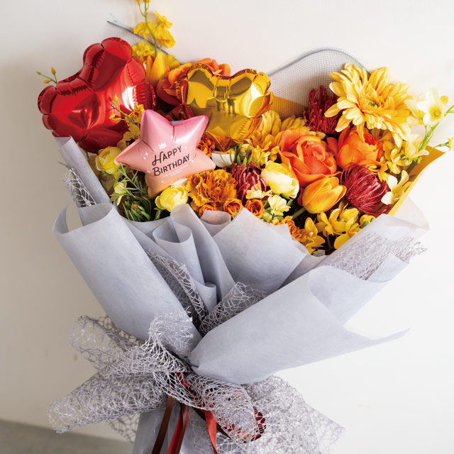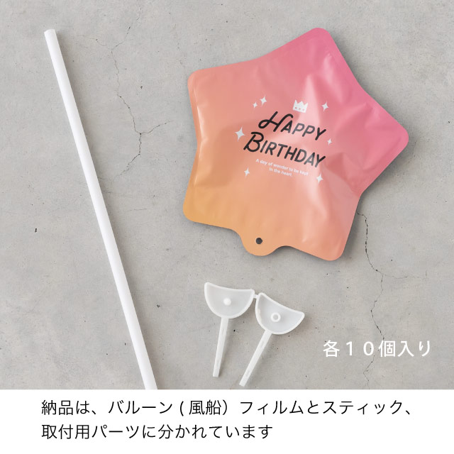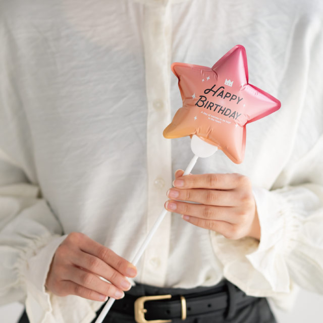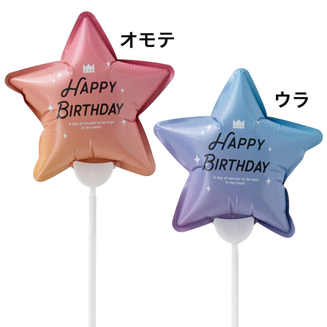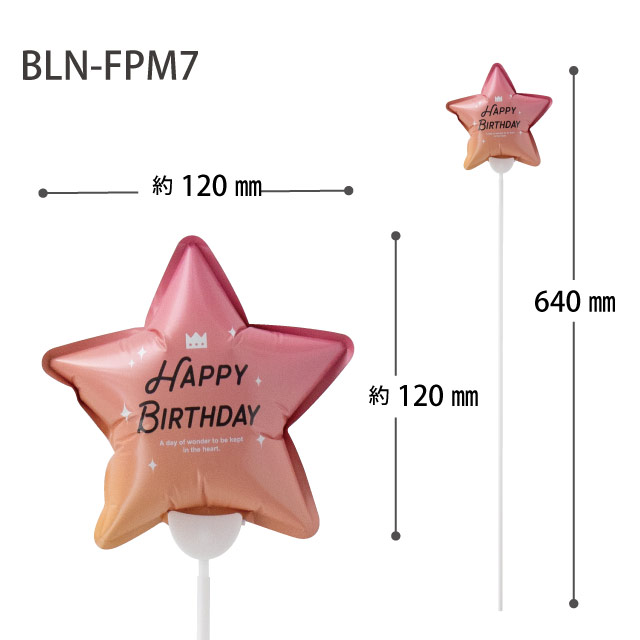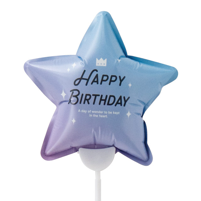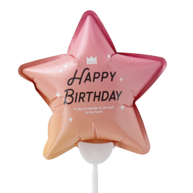 パステルカラーのグラデーションに「Happy Birthday」のメッセージをあしらった、ふんわりかわいい星形のバルーンフラワーピックです。表裏でピンクとブルーの2色が楽しめるデザインなので、お花のカラーに合わせてお使いいただけます。縦横120mmサイズで存在感があり、少ない花材でもボリュームのある可愛いバースデイブーケに仕上がるバルーンピックです。。