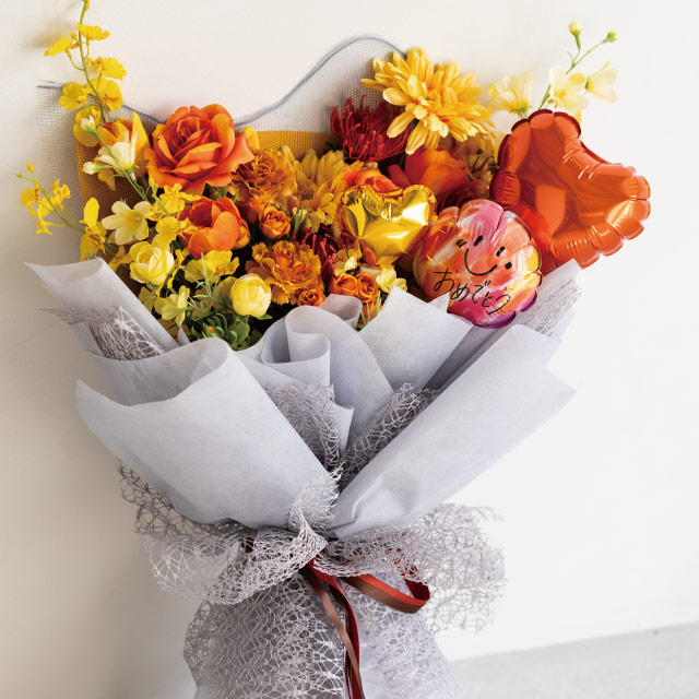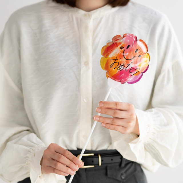 「おめでとう」というメッセージをあしらった色鮮やかなバルーンフラワーピックです。縦横110mmでほど良い存在感があり、少ない花材でもボリュームのある可愛いブーケが仕上がります。発表会や入学卒業、バースデー、成人式など、お祝いシーンやイベントにおすすめです。