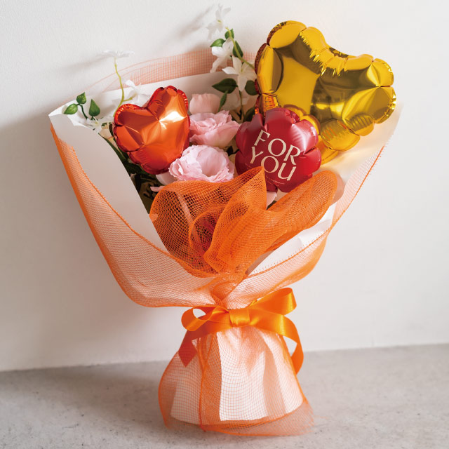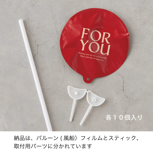「FOR YOU」のメッセージをあしらったバルーンフラワーピックです。表裏で赤とクリーム色の2パターンの配色を楽しめるデザインなので、お花のカラーに合わせてお使いいただけます。発表会や入学卒業、バースデー、成人式などのお祝いシーンや母の日などのイベントにおすすめのバルーンピックです。
