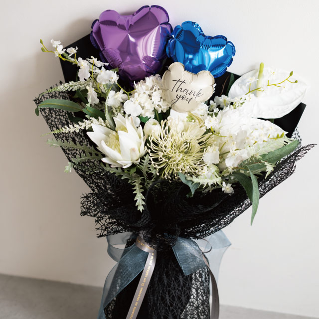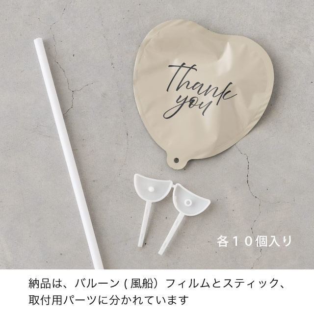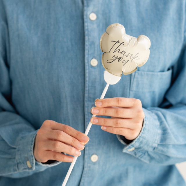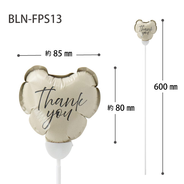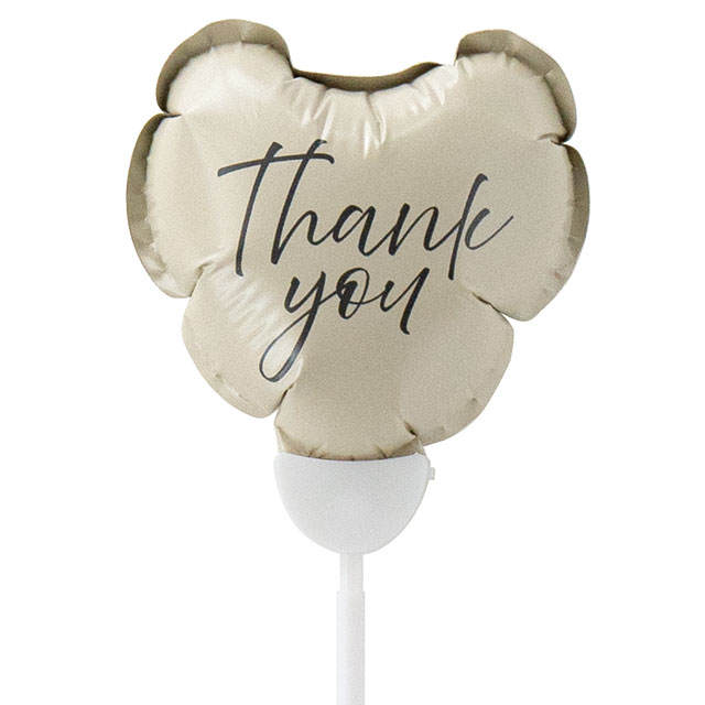 「Thank you」のメッセージをあしらった、シンプルなアイボリーのハート型のバルーンフラワーピックです。ブーケやフラワーアレンジメントにはもちろん、焼き菓子セットやギフトボックスにも差し込むだけでボリューム感のあるラッピングが完成。母の日や父の日などの感謝を伝えるイベントにおすすめです。無地にテキストを添えたシンプルなデザインなので、幅広い世代にお送りいただけるバルーンピックです。