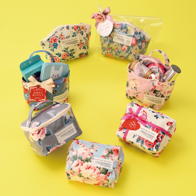 キレイな花柄が大人気のボンフルールシリーズに新デザインのポーチが登場!グレー地に大ぶりの花柄をあしらった上品なハンドル付きポーチです。ポーチにお菓子や雑貨などを合わせたセットギフトにおすすめです。