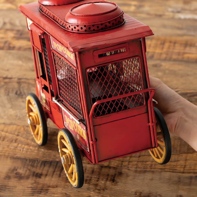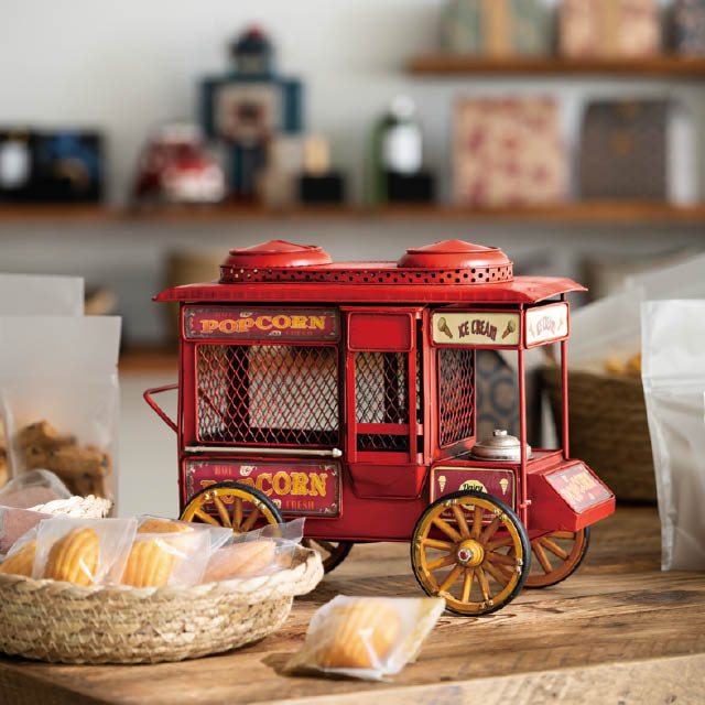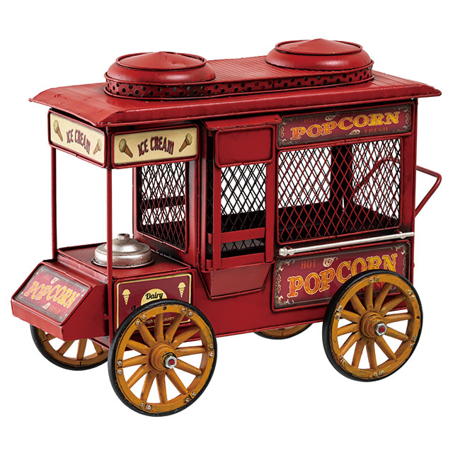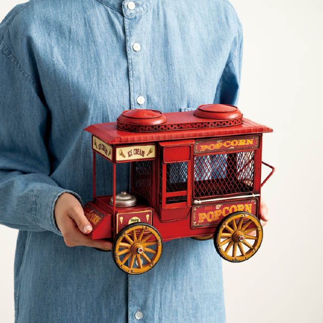 アンティーク調のデザインがおしゃれな装飾用のブリキバス(ポップコーンワゴン)です。存在感があり、置くだけで売り場のアクセントに。棚飾りなどのお店の雰囲気づくりにも使えるお役立ちアイテムです。雑貨店さまはもちろん、アパレル店さまや飲食店さまなどに特におすすめです。