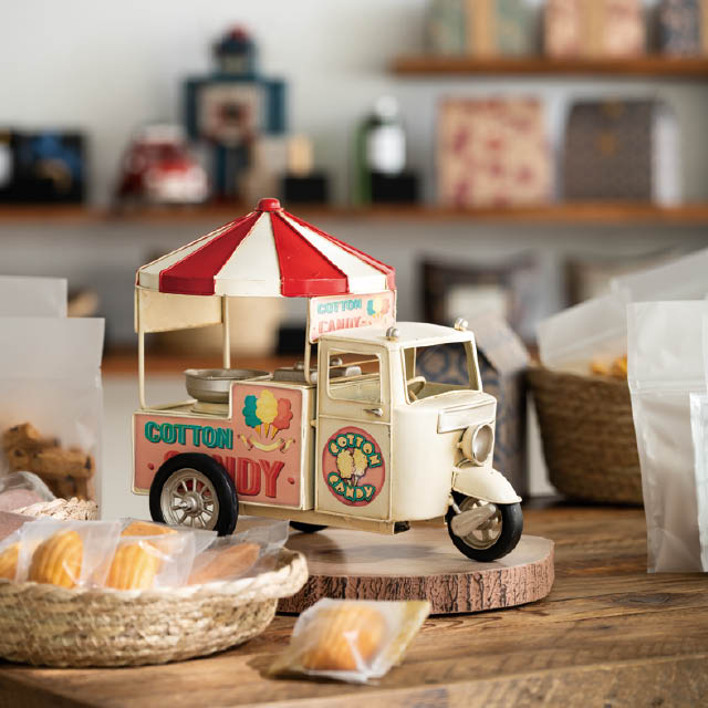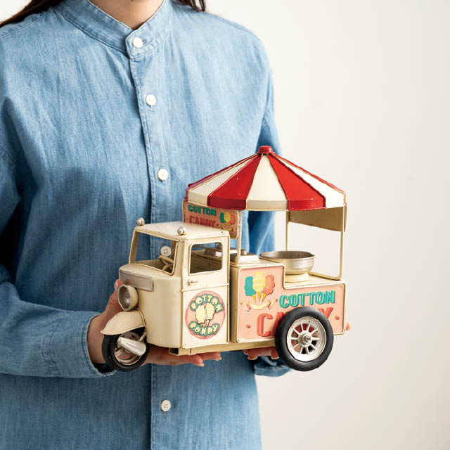 アンティーク調のデザインがおしゃれな装飾用のブリキバス(綿菓子トラック)です。存在感があり、置くだけで売り場のアクセントに。棚飾りなどのお店の雰囲気づくりにも使えるお役立ちアイテムです。雑貨店さまはもちろん、アパレル店さまや飲食店さまなどに特におすすめです。
