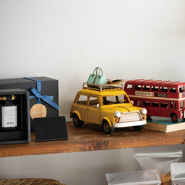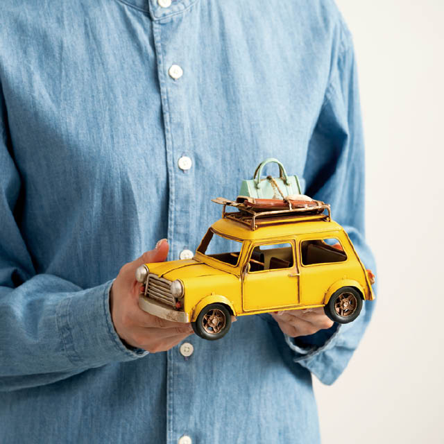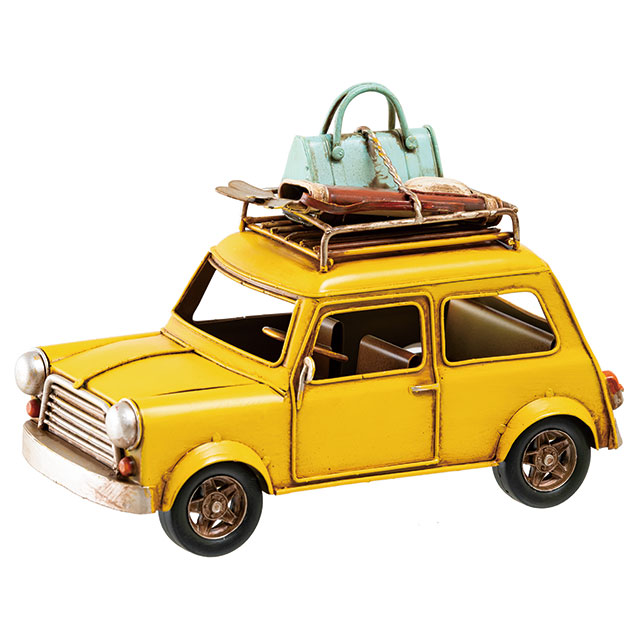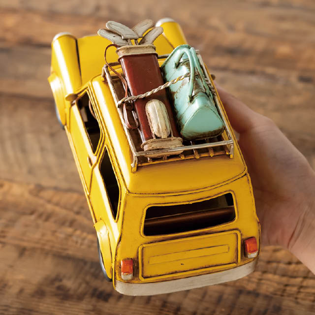 アンティーク調のデザインがおしゃれな装飾用のブリキ製の黄色の車です。存在感があり、置くだけで売り場のアクセントに。棚飾りなどのお店の雰囲気づくりにも使えるお役立ちアイテムです。雑貨店さまはもちろん、アパレル店さまや飲食店さまなどに特におすすめです。