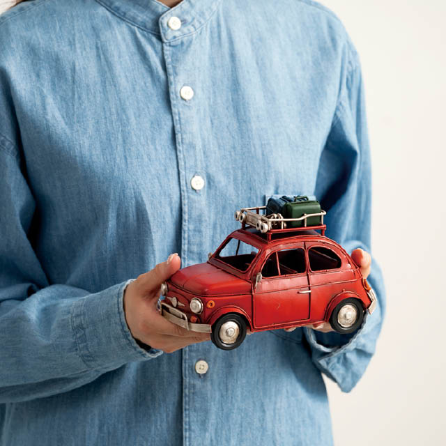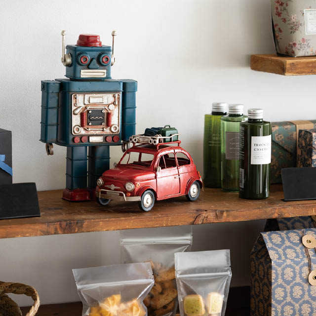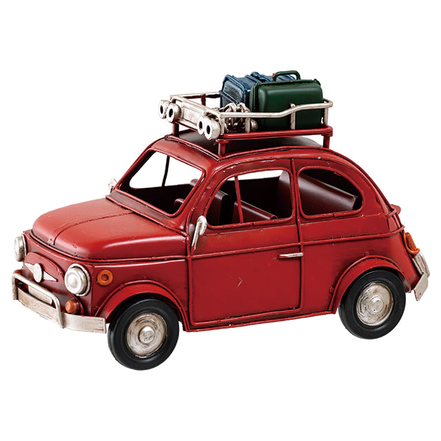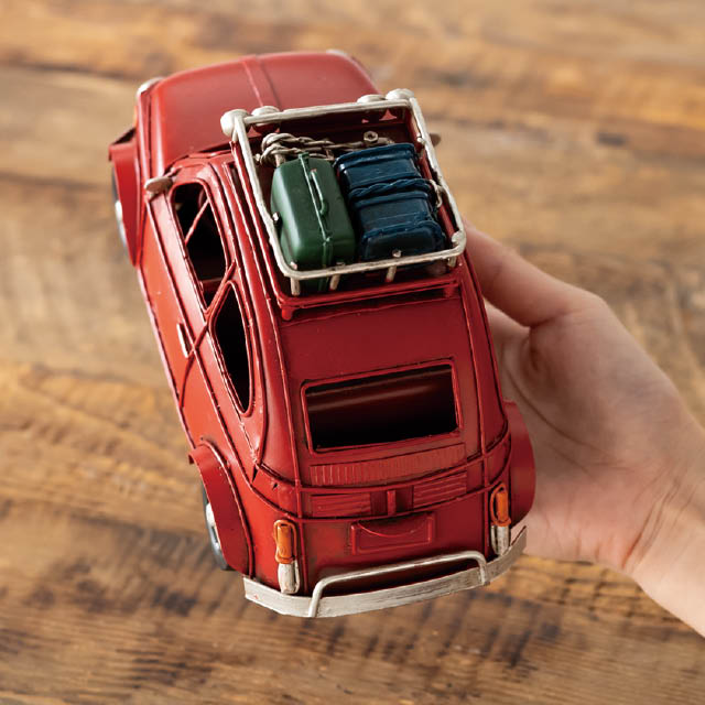 アンティーク調のデザインがおしゃれな装飾用のブリキ製の赤の車です。存在感があり、置くだけで売り場のアクセントに。棚飾りなどのお店の雰囲気づくりにも使えるお役立ちアイテムです。雑貨店さまはもちろん、アパレル店さまや飲食店さまなどに特におすすめです。