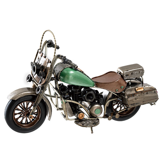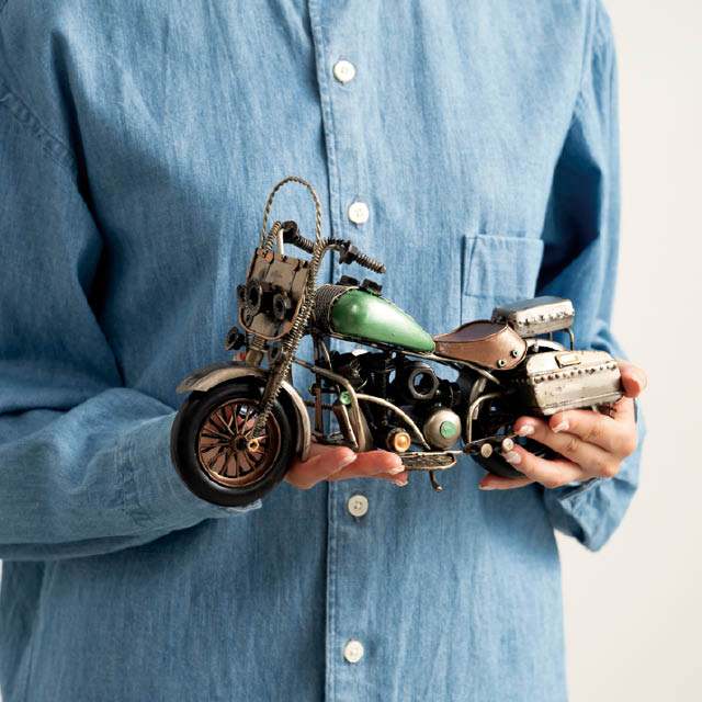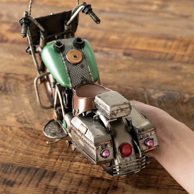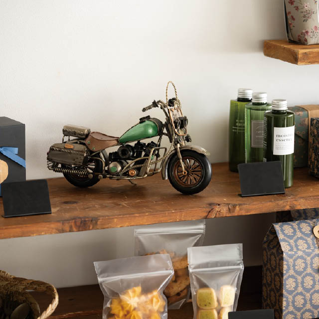 アンティーク調のデザインがおしゃれな装飾用のブリキ製のアメリカンバイクです。存在感があり、置くだけで売り場のアクセントに。棚飾りなどのお店の雰囲気づくりにも使えるお役立ちアイテムです。雑貨店さまはもちろん、アパレル店さまや飲食店さまなどに特におすすめです。