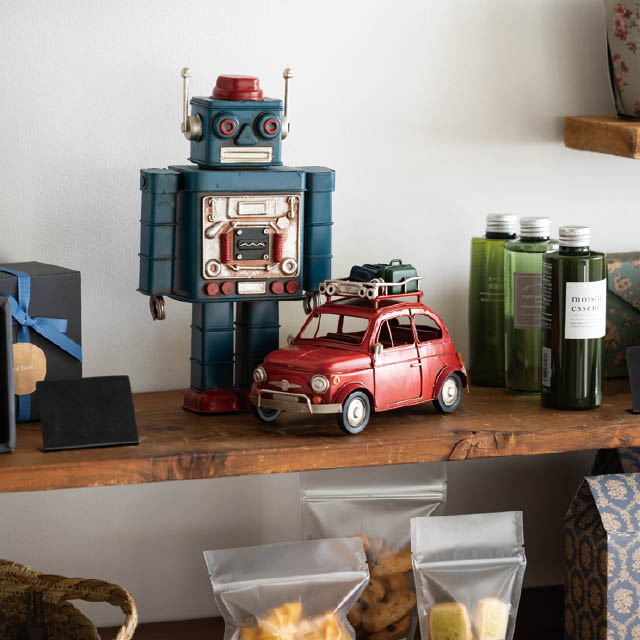アンティーク調のデザインがおしゃれな装飾用のブリキ製のロボットです。存在感があり、置くだけで売り場のアクセントに。棚飾りなどのお店の雰囲気づくりにも使えるお役立ちアイテムです。雑貨店さまはもちろん、アパレル店さまや飲食店さまなどに特におすすめです。