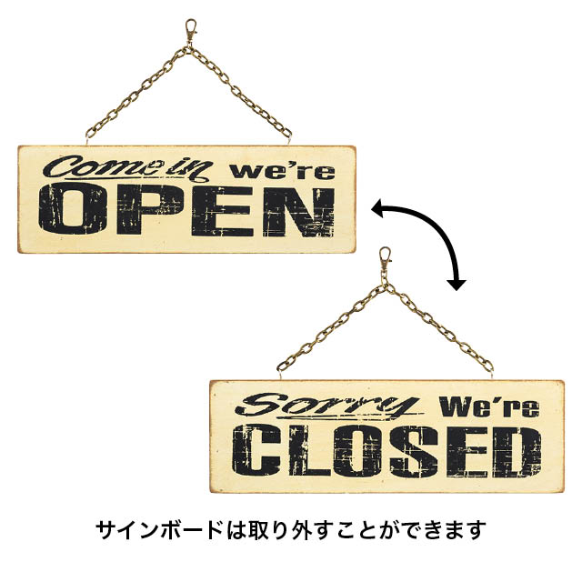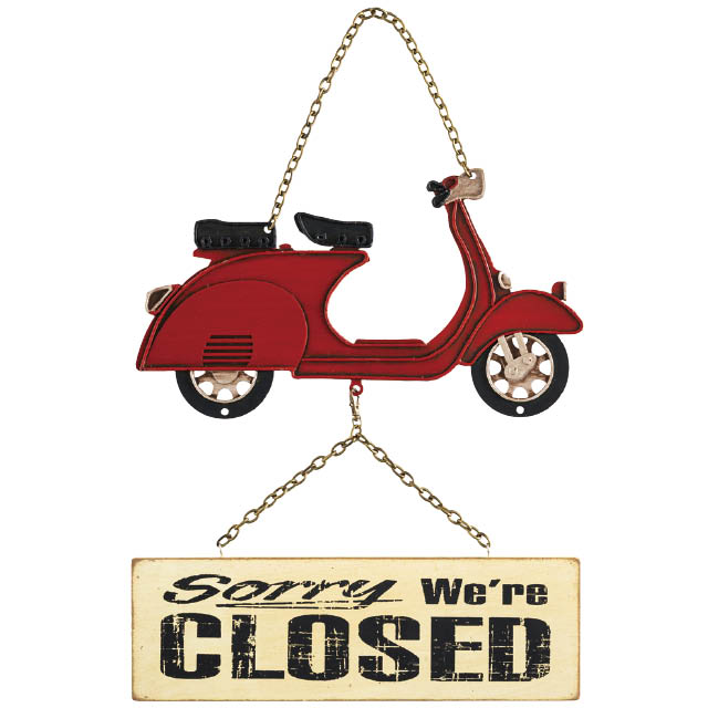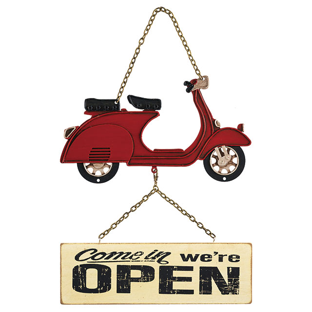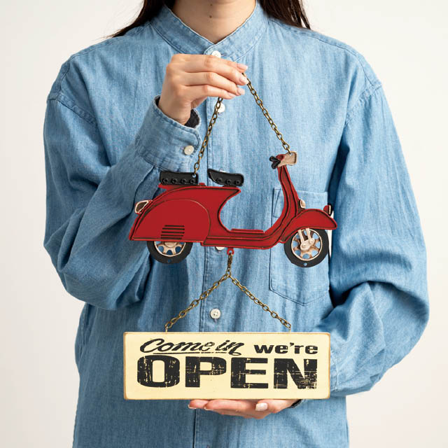 アンティーク調のデザインがおしゃれなスクーターの壁掛けサインボードです。裏表に「OPEN/CLOSED」のドアプレートがついています。ドアプレートは取り外しできるので、壁飾りとしてもお使いいただけます。雑貨店さまはもちろん、アパレル店さまや飲食店さまなどに特におすすめです。