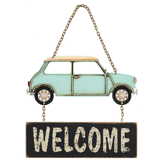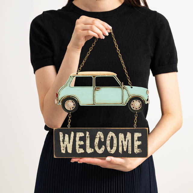 アンティーク調のデザインがおしゃれな車の壁掛けサインボードです。「WELCOME」のドアプレートがついています。雑貨店さまはもちろん、アパレル店さまや飲食店さまなどに特におすすめです。