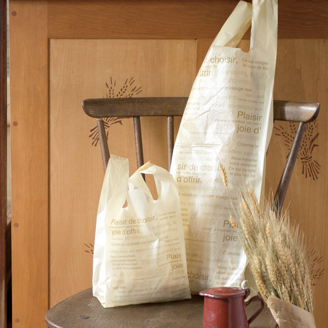 優しい色味のレジ袋です。SSから縦長サイズまであるので、小さな雑貨からフランスパンや一輪ブーケなど細長いものまで幅広いサイズの商品に対応します。