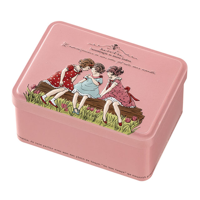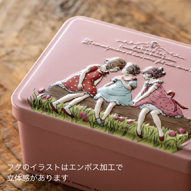 売上金の一部がチャリティーとして寄付されるギフト缶です。蓋はレトロかわいい女の子たちがエンボス加工でぷっくりと浮かび上がり、缶の中面にもおしゃれなデザインが入っています。たくさんのこだわりが詰まったギフト缶をラッピングに使って、無理のない範囲でチャリティー活動を始めてみませんか?