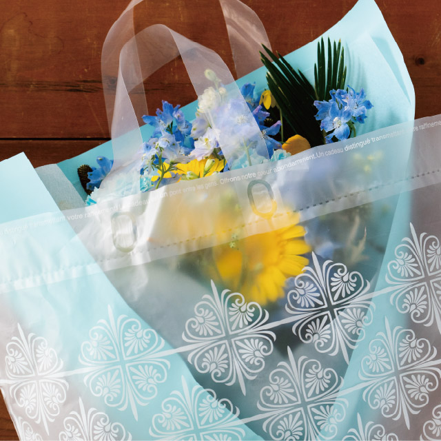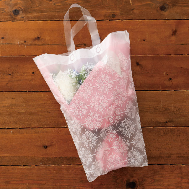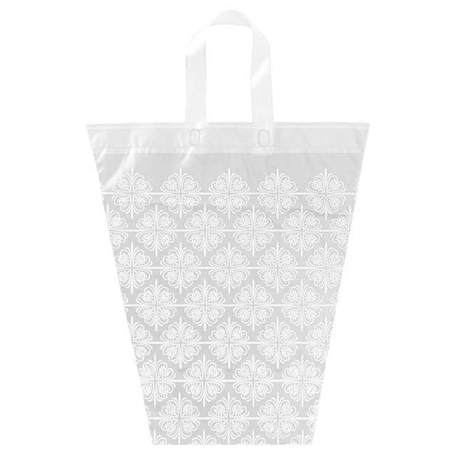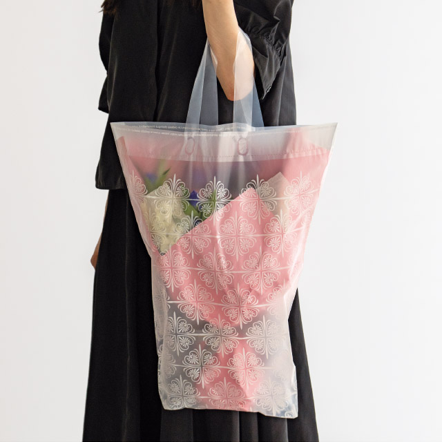 ブーケ用のバケツ型ハンドル付手提げ袋です。中のお花がうっすら透けて見える半透明のPE素材が華やかな花束を引き立てます。白のダマスク柄をあしらった華やかなデザインで、しっかりとした厚みもあり、ギフト用やお持ち帰り用として幅広くご活用いただけます。定番サイズの花束がしっかり収まるバケツ型のバッグです。