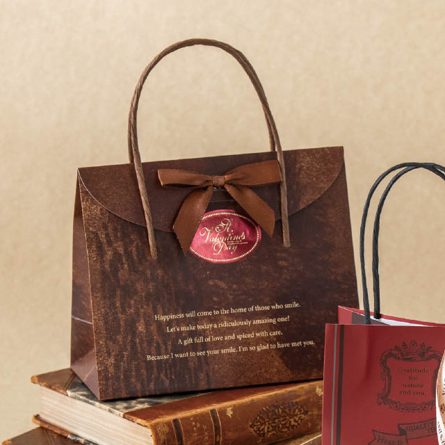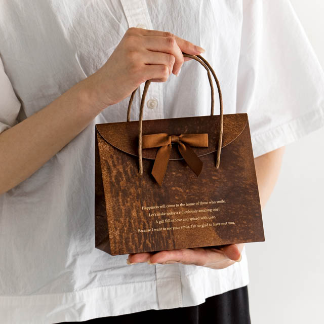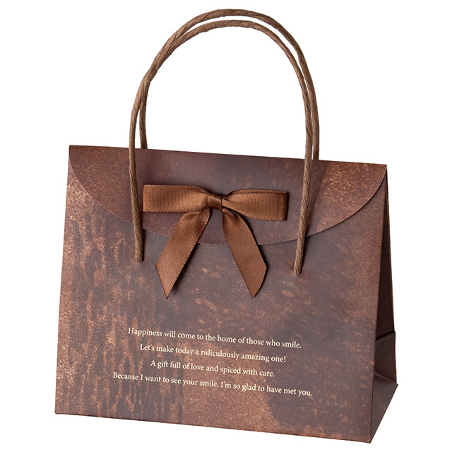 ブラウンのペーパーバッグ(紙袋)です。クレヨンアート風のデザインが入った落ち着いたブラウンに、同色のサテンリボンを合わせたシンプルなデザインで、季節を問わず通年で使いやすいラッピング袋です。可愛い丸いフラップで封をした後は、付属の両面テープでリボンをお好みの場所に付けるだけでラッピングが簡単に完成!忙しい時期のプチギフト作りにも活躍します。自立したハンドル付で手に取りやすく、そのままお持ち帰りいただけるのもおすすめポイントです。