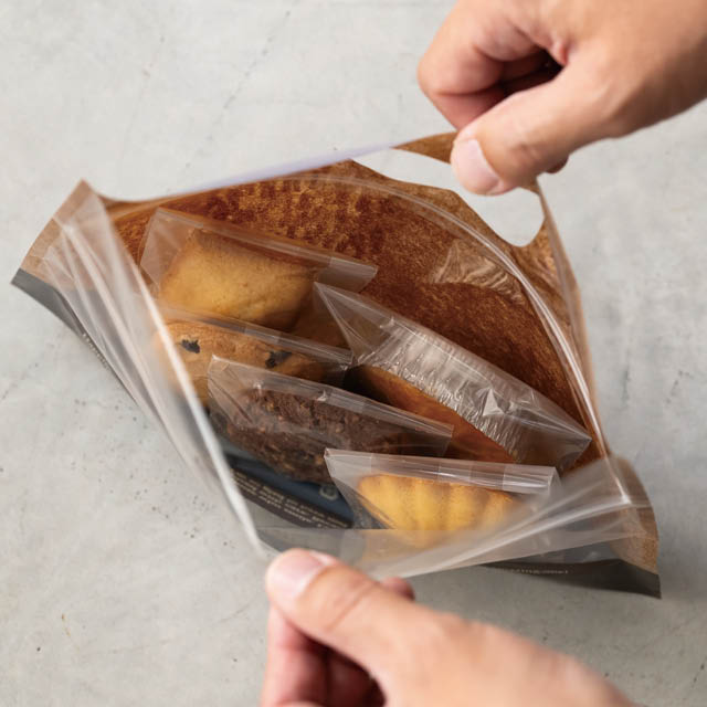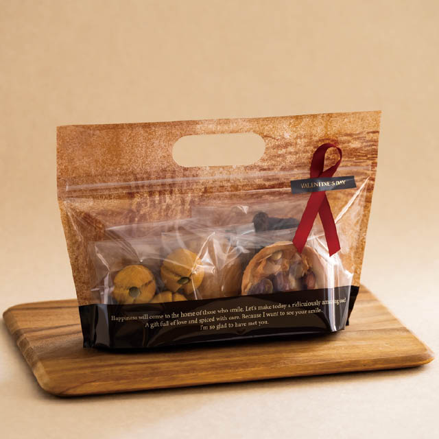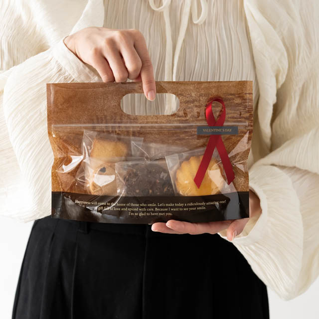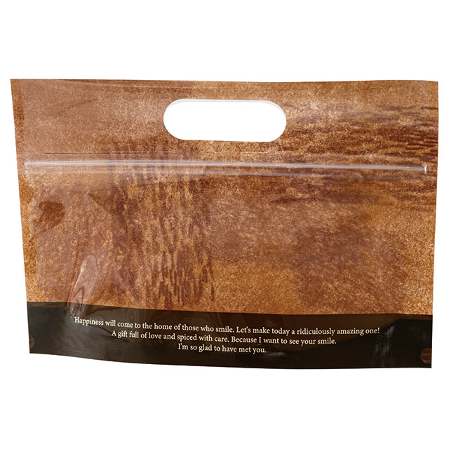 ブラウンの横長タイプのジップ付スタンドバッグです。ジップ付なので商品を入れるだけで完成。クレヨンアート風のデザインが入った落ち着いたブラウンで、お手軽なギフトながらも高級感を演出します。ハンドル付で手に取りやすく、お買い上げ後このまま持ち帰りいただけるのもポイントです。マドレーヌが5個程度入るほど良いサイズ感で、お手軽ギフトにおすすめのジップ付スタンドバッグです。