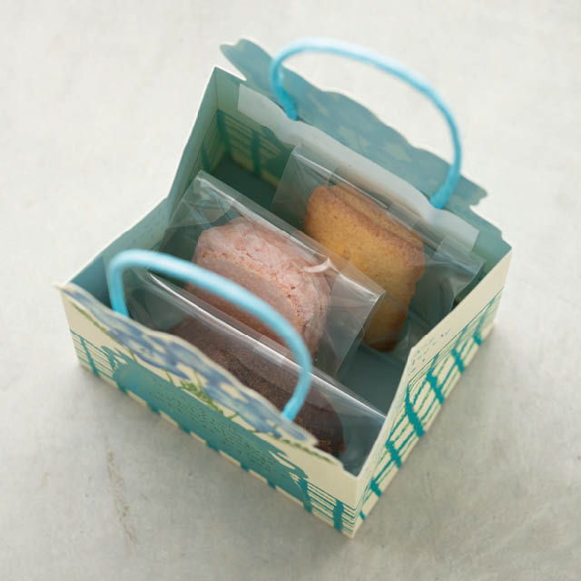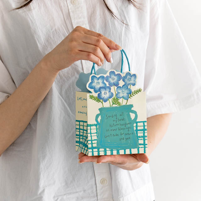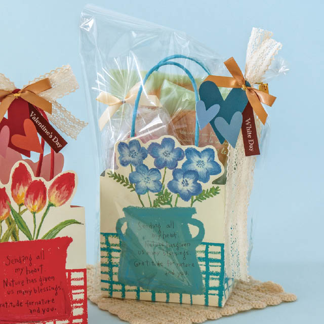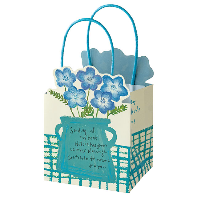 ネモフィラのイラストが目を引くペーパーバッグ(紙袋)です。クレヨンで描いたブルーのネモフィラと花瓶の可愛いイラストが売り場を明るく華やかに演出します。マドレーヌが3個程度入るほど良いサイズ感でお手軽ギフトにぴったり。自立したハンドル付で手に取りやすく、そのままお持ち帰りいただけるのもポイントです。通年お使いいただけけるデザインですが、特に春の季節感の演出におすすめしたいギフトバッグです。