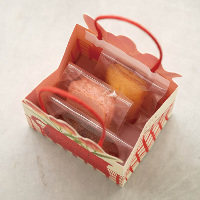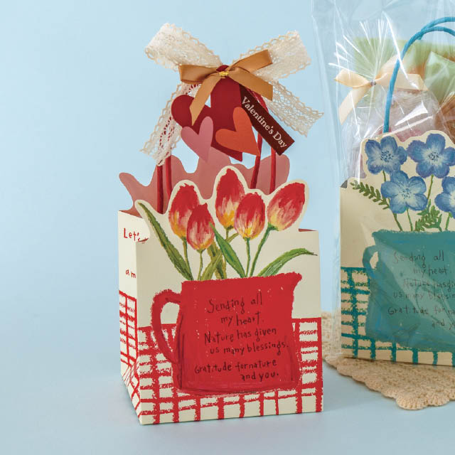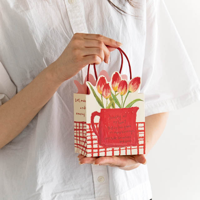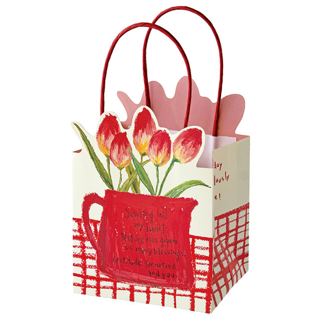 チューリップのイラストが目を引くペーパーバッグ(紙袋)です。クレヨンで描いた赤のチューリップと花瓶の可愛いイラストが売り場を明るく華やかに演出します。マドレーヌが3個程度入るほど良いサイズ感でお手軽ギフトにぴったり。自立したハンドル付で手に取りやすく、そのままお持ち帰りいただけるのもポイントです。通年お使いいただけけるデザインですが、特に春の季節感の演出におすすめしたいギフトバッグです。