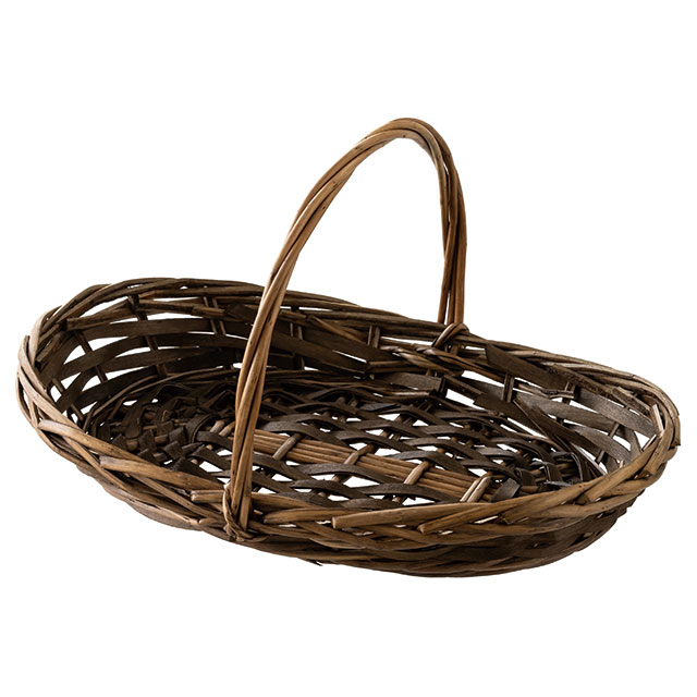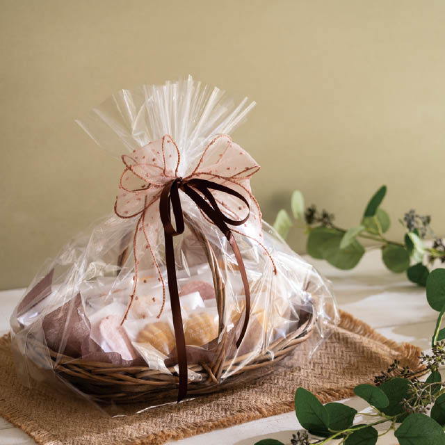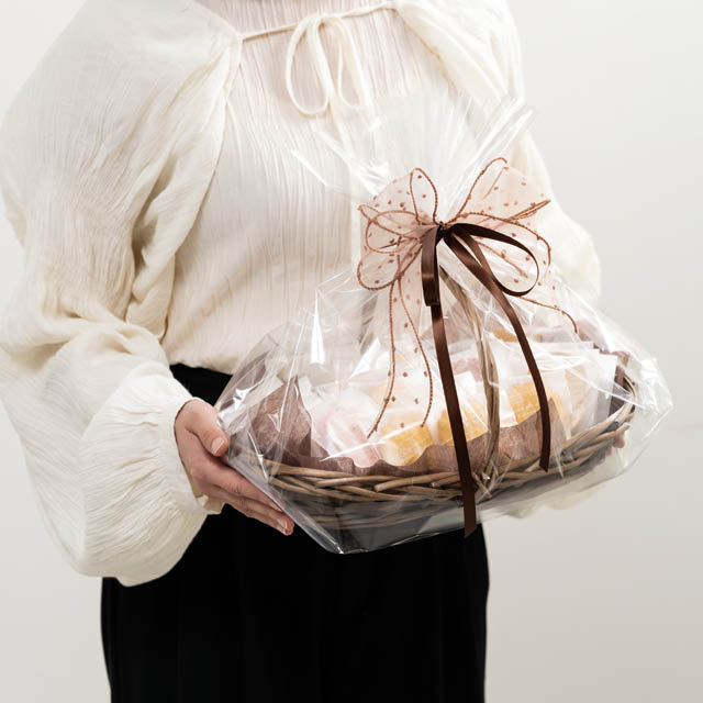 こげ茶色のハンドル付バスケットです。浅型でお菓子を詰めやすく、緩衝材を入れなくても中身が沈まず美しくレイアウトできるため、見栄えのするギフトが作れます。落ち着いたこげ茶色がギフトに高級感を演出。焼き菓子が18個程度入るサイズ感で、5000円程度のカゴ盛りギフトにおすすめです。季節のギフトやイベント、お祝い事からお供えまで、幅広いギフトラッピングにご活用いただけるバスケットです。