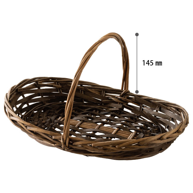 こげ茶色のハンドル付バスケットです。浅型でお菓子を詰めやすく、緩衝材を入れなくても中身が沈まず美しくレイアウトできるため、見栄えのするギフトが作れます。落ち着いたこげ茶色がギフトに高級感を演出。焼き菓子が18個程度入るサイズ感で、5000円程度のカゴ盛りギフトにおすすめです。季節のギフトやイベント、お祝い事からお供えまで、幅広いギフトラッピングにご活用いただけるバスケットです。