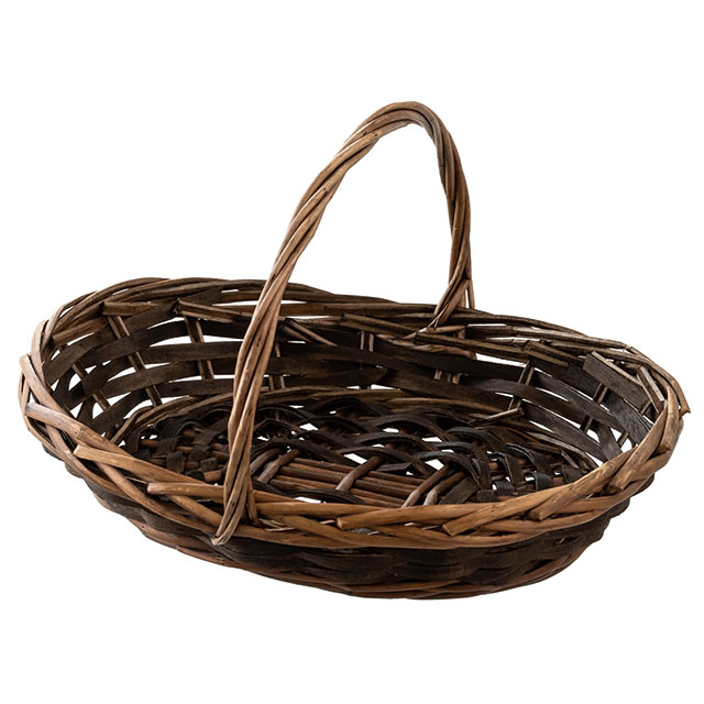 こげ茶色のハンドル付バスケットです。浅型でお菓子を詰めやすく、緩衝材を入れなくても中身が沈まず美しくレイアウトできるため、見栄えのするギフトが作れます。落ち着いたこげ茶色がギフトに高級感を演出。焼き菓子が10個程度入るサイズ感で、3000円程度のカゴ盛りギフトにおすすめです。季節のギフトやイベント、お祝い事からお供えまで、幅広いギフトラッピングにご活用いただけるバスケットです。