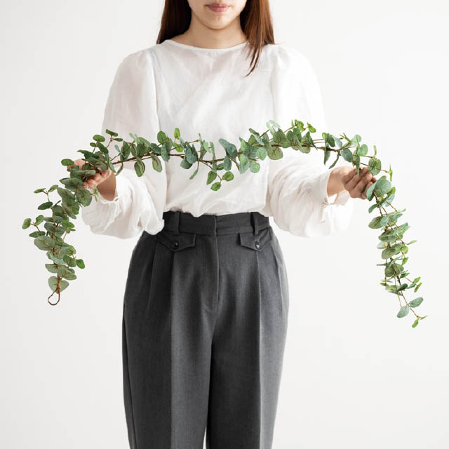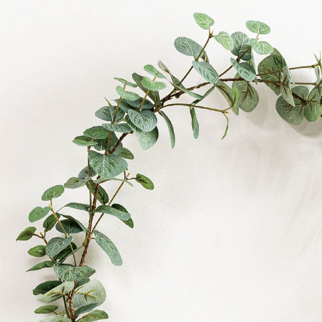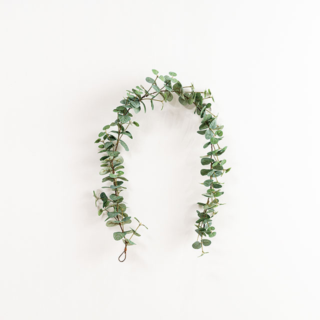 ユーカリ風の造花ガーランドです。リアルな葉の質感がナチュラルで優しい雰囲気を店内を演出。両端には取り付け用のリングが付いているので、飾り付けも簡単。シンプルなデザインだからこそ、他の造花やガーランドとも相性抜群。季節を問わず、一年中インテリアやディスプレイとして様々なシーンで活躍するガーランドです。