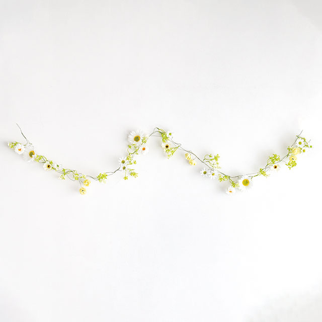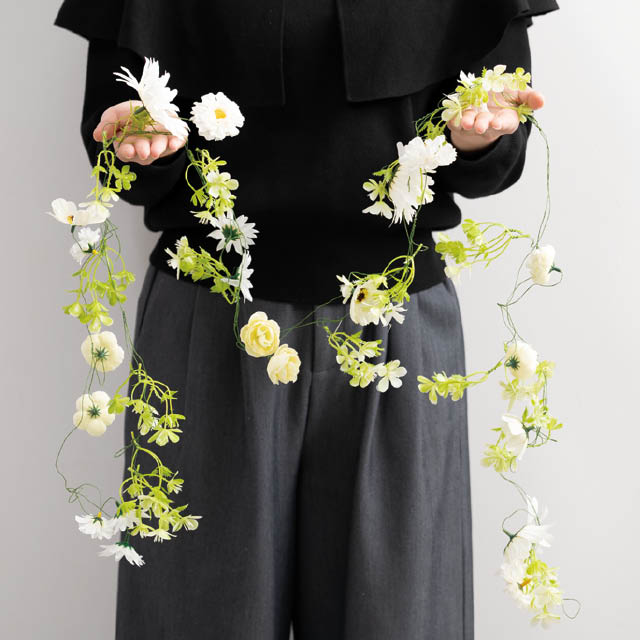 白の小花が連なる店舗装飾アイテム(ガーランド)です。ワイヤーにバランスよく配された小ぶりの花たちは、どんなインテリアとも相性抜群。ウィンドウディスプレイやカウンター上、天井や壁面のアクセントなど、設置するだけで店頭の雰囲気を一気にランクアップ。可愛い白の花が売り場にフレッシュに彩り、季節を問わずお使いいただけます。