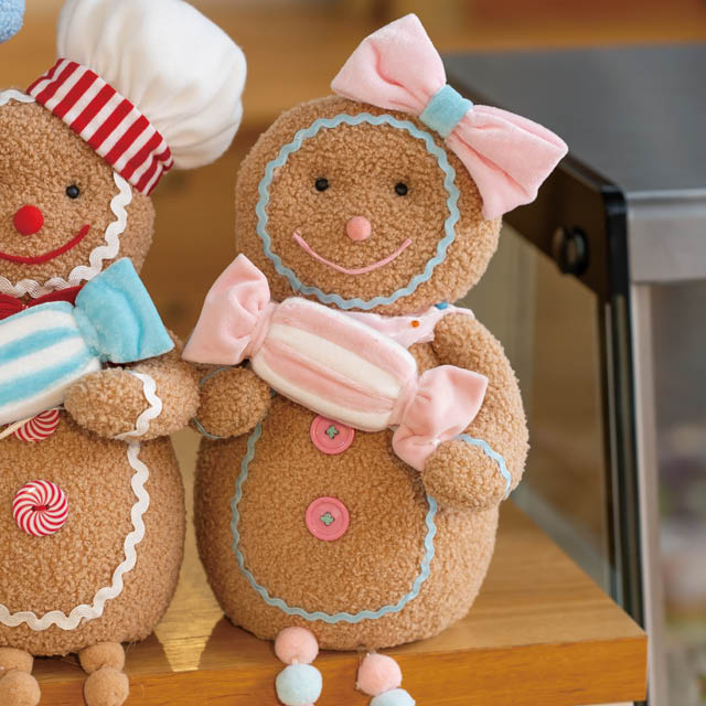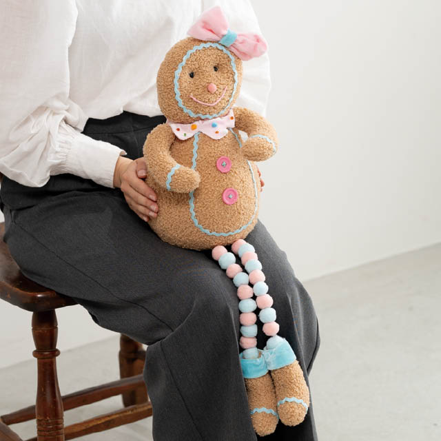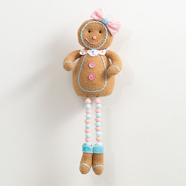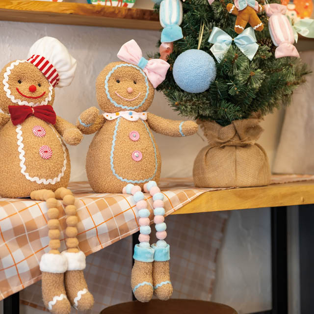 ジンジャーマン風のオーナメントです。ピンクのリボンとカラフルな足がアクセントになっていて、見た目もとってもキュート!にっこり笑顔でお客様を温かくお出迎えします。身長650mmのしっかり存在感のあるサイズで、お部屋や店舗のディスプレイにぴったり。棚やカウンター、店頭など、クリスマスシーズンのディスプレイに特におすすめのオーナメントです。