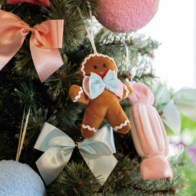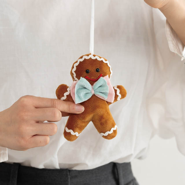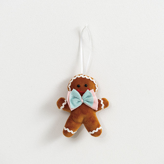ジンジャーマンのオーナメントです。ブルーとピンクの大きなネクタイがアクセントになっていて、見た目もとってもキュート!にっこり笑顔でお客様を温かくお出迎えします。身長120mmの程よい大きさで、お部屋や店舗のディスプレイにぴったり。クリスマスツリーにはもちろん、年間通して棚やカウンター、店頭などのディスプレイにおすすめのオーナメントです。
