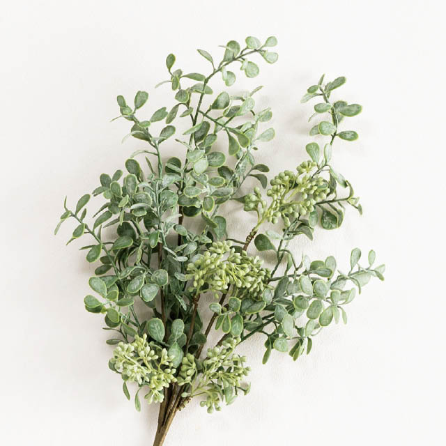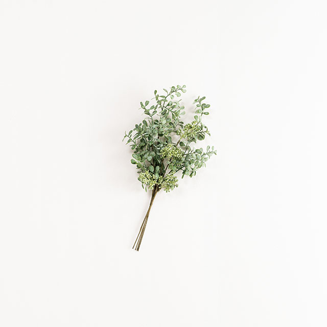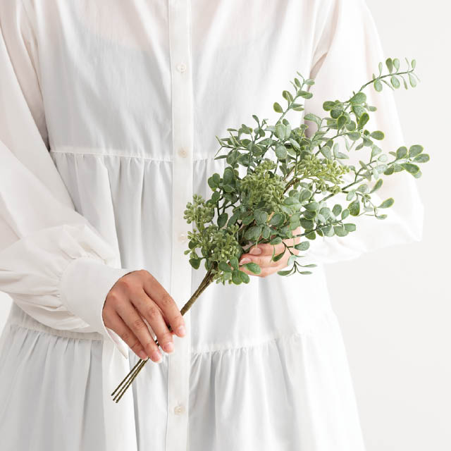 スプレータイプのグリーンの造花です。1本の茎から自然に枝分かれしたデザインで、ボリューム感もたっぷり。使いやすいW240×H520サイズで、花器に挿すだけで店内が華やかに。シンプルなデザインなので、他の造花と組み合わせてアレンジするのもおすすめです。季節を問わず通年使えるアイテムとして、ショップのディスプレイやお部屋のインテリアなど、様々なシーンにお使いいただけるグリーンの造花です。