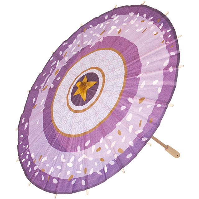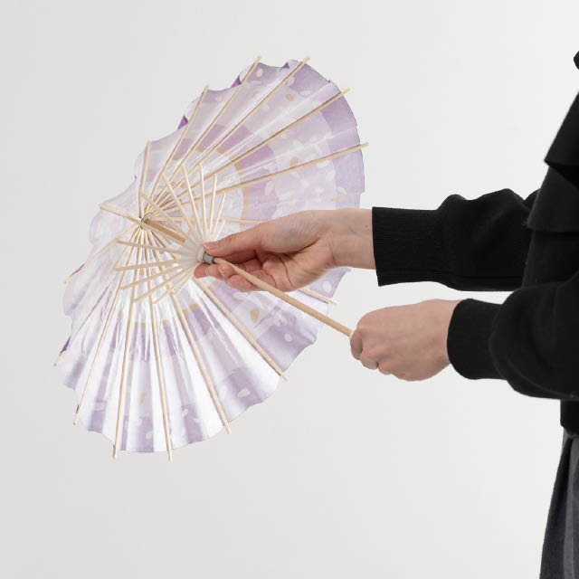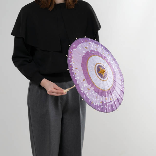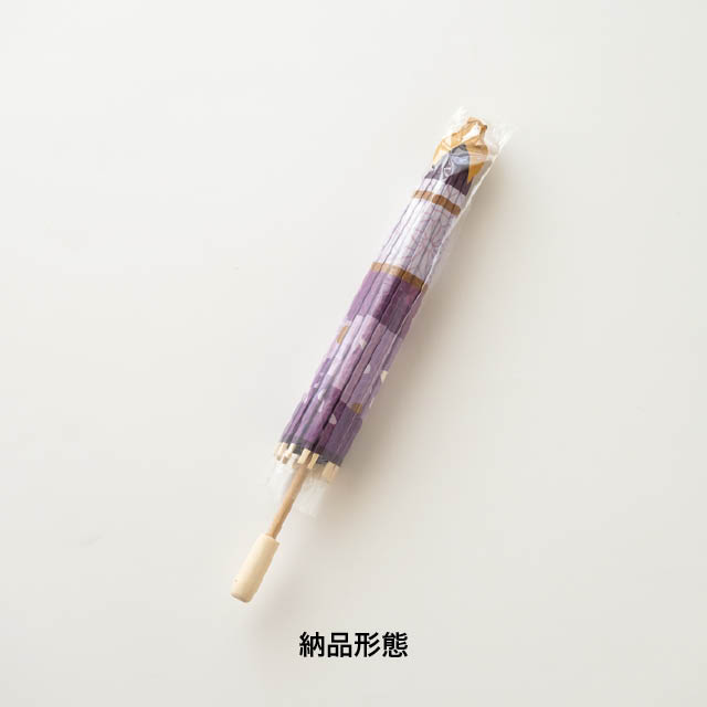 紫の和柄がきれいな店内装飾用の和傘です。直径400mmの使いやすいサイズ感。藤の花をイメージした紫の濃淡と、麻の葉柄や花びら模様を散らした和モダンで華やかなデザインが、初夏の売り場を爽やかに演出します。