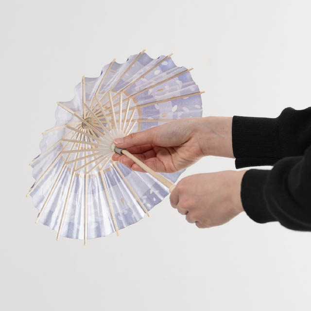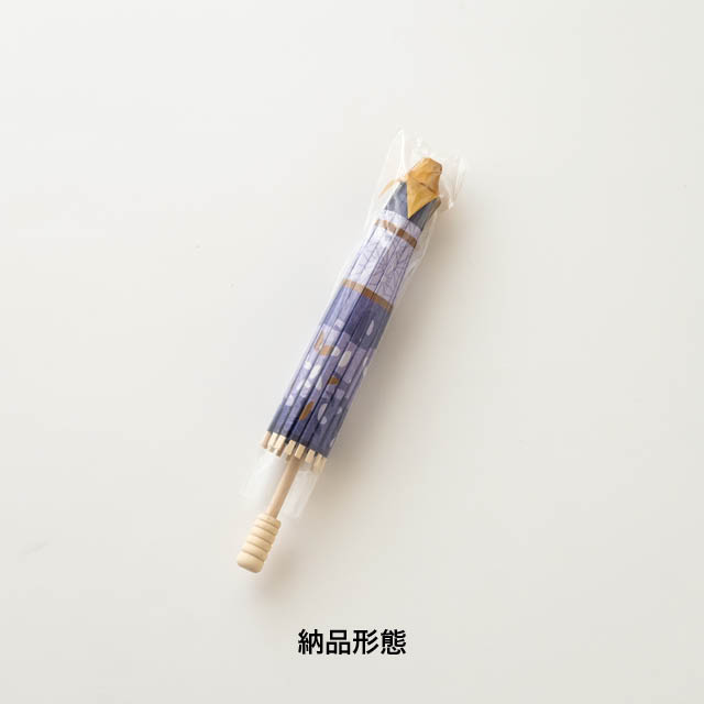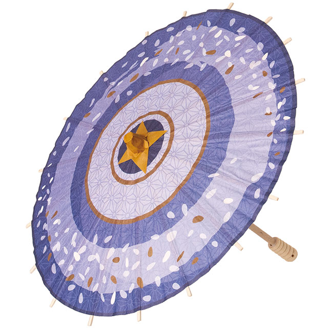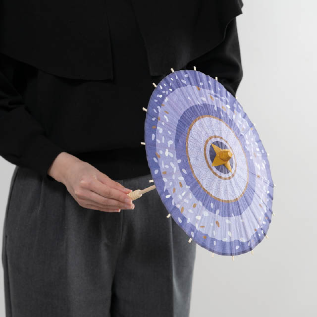 青紫の和柄がきれいな店内装飾用の和傘です。直径300mmのミニサイズなので小さめの売り場にもぴったり。藤の花をイメージした青紫の濃淡と、麻の葉柄や花びら模様を散らした和モダンで華やかなデザインが、初夏の売り場を爽やかに演出します。