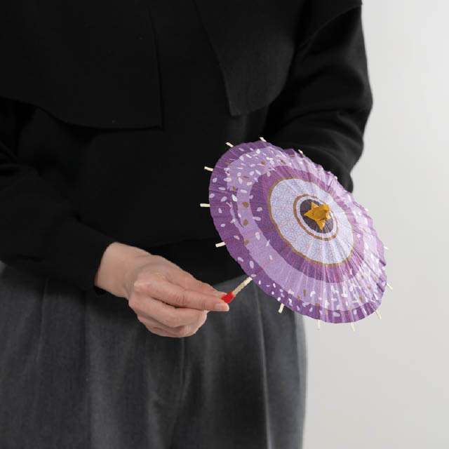 紫の和柄がきれいな店内装飾用の和傘です。直径200mmのミニサイズなので小さめの売り場や、レジ横やカウンター周りにもぴったり。藤の花をイメージした紫の濃淡と、麻の葉柄や花びら模様を散らした和モダンで華やかなデザインが、初夏の売り場を爽やかに演出します。
