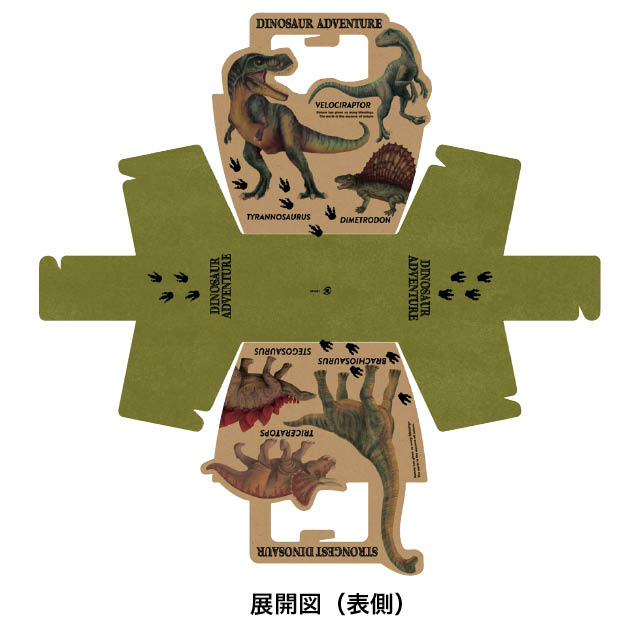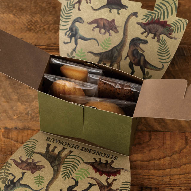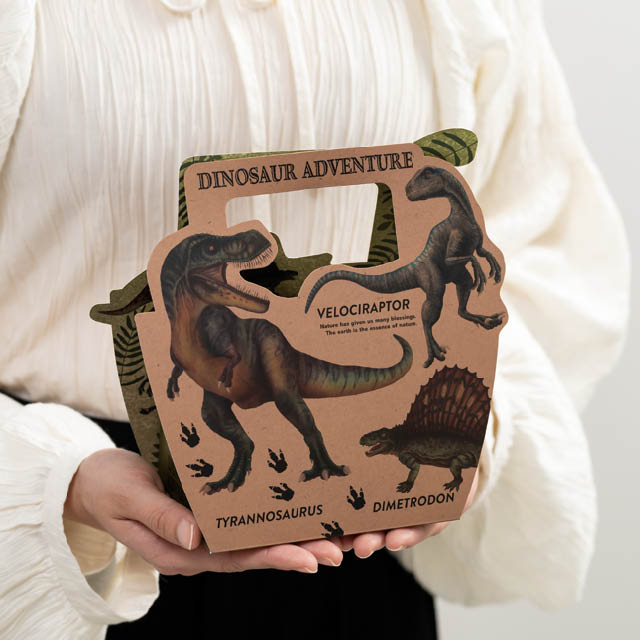 リアルタッチの恐竜イラストをあしらったハンドル付ギフトボックスです。表面にはティラノサウルスやヴェロキラプトル、裏面にはブラキオサウルス、トリケラトプス、ステゴサウルスなど人気の恐竜を大胆に配置。裏表で違うイラストが楽しめ、さらに内側にも恐竜のイラストと足跡デザインが施され、ギフトを開けるワクワク感をさらにアップさせます。恐竜好きなお子さまにはもちろん、落ち着いたクラフトカラーとスタイリッシュなデザインは大人向けにも◎。こどもの日のギフトにもおすすめのギフトボックスです。