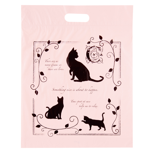甘いピンクベースに黒猫のシルエットがエレガントな小判抜きのポリ袋です。上品でおしゃれなデザインが大人の女性に喜ばれます。洋菓子店さんや雑貨屋さんなど、女性がターゲットのお店様におすすめの商品です。