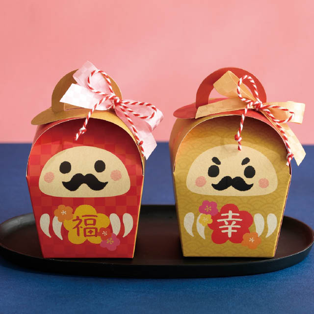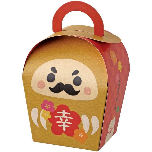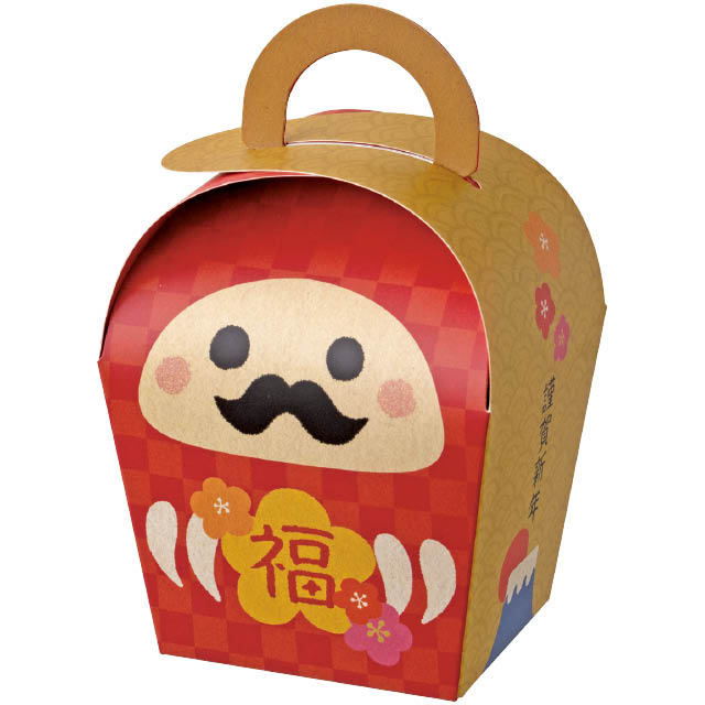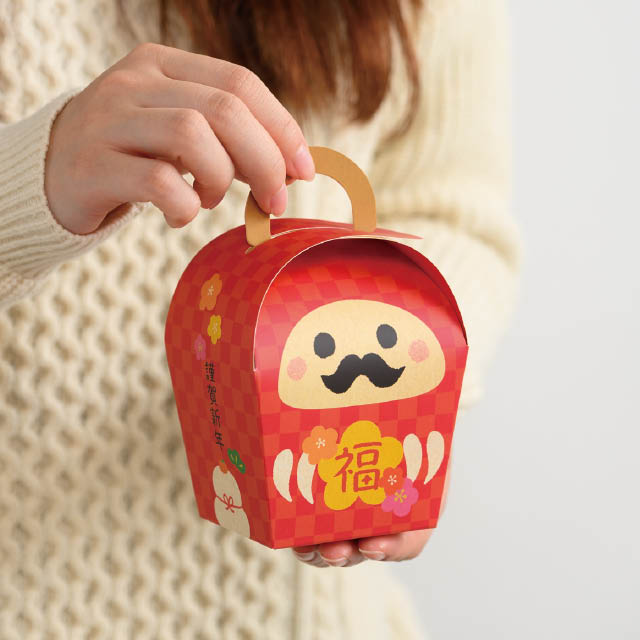 可愛らしいだるまデザインのギフトボックスです。裏表で2通りのディスプレイが楽しめ、より一層新年の店頭を盛り上げてくれます。組み立ても簡単で使いやすい人気のギフトボックスです。新年のお手軽ギフトにいかがですか?