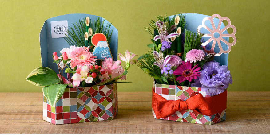 ワンタッチ底で簡単にセットできるアーパス(フローラルフォーム)1/3サイズの紙製トレーです。インナーカップがついていますので、カンタンにお花をセットできます。モダンでカラフルなデザインで華やかな迎春アレンジにぴったりです。