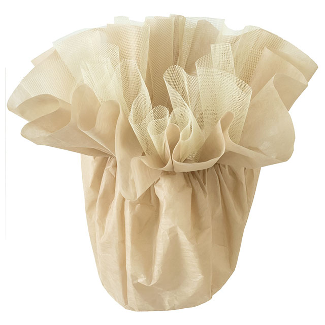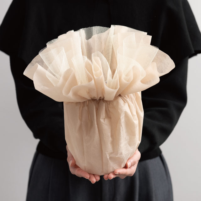 5号苗サイズにおすすめのベージュのポットラッピング資材(鉢カバー)です。お花を入れるだけでカンタンに華やかなラッピングが完成!不織布とレースの各層を広げてお好みの形に整えることで更にボリュームたっぷりな仕上がりに。カーネーションやシクラメンなど、様々な苗物をキレイに包めます。内側はビニール加工をしているので、多少の水濡れや土汚れも心配ありません。母の日需要が高まる忙しい時の強い味方!